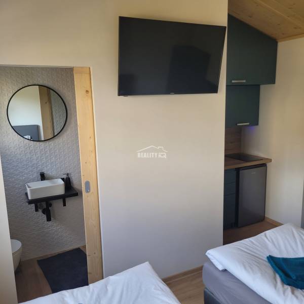 Dispozícia domu: vstupná chodba, jedna nepriechodná izba, loft, plne vybavená kúpeľňa so sprchou a WC. Obývacia izba je spojená s plnohodnotnou kuchyňou, z ktorej je východ na terasu.